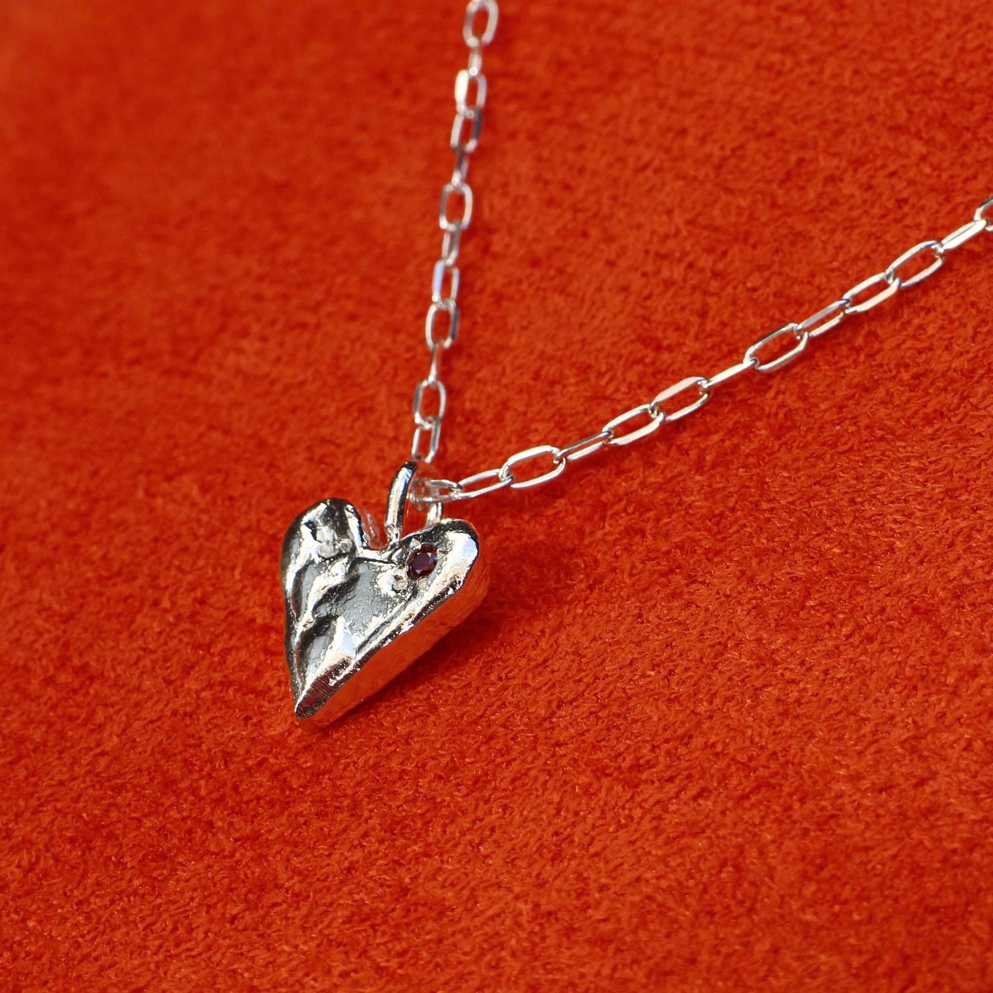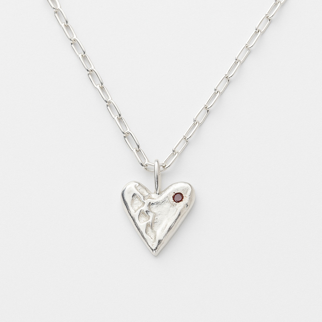 בתוך הכסף משובצת אבן גארנט קטנה בצבע אדום עמוק - עדינה, אך מלאת נוכחות. גארנט ידועה כאבן של הארקה, תשוקה והגנה. היא נבחרה בכוונה תחילה, כדי לשמש כתזכורת לאש הפנימית שלך. האבן, הממוקמת ליד קצה הלב, נראית כמעט כמו טיפת דם או גחל בוערת - תלוי איך תבחרו לראות אותה.