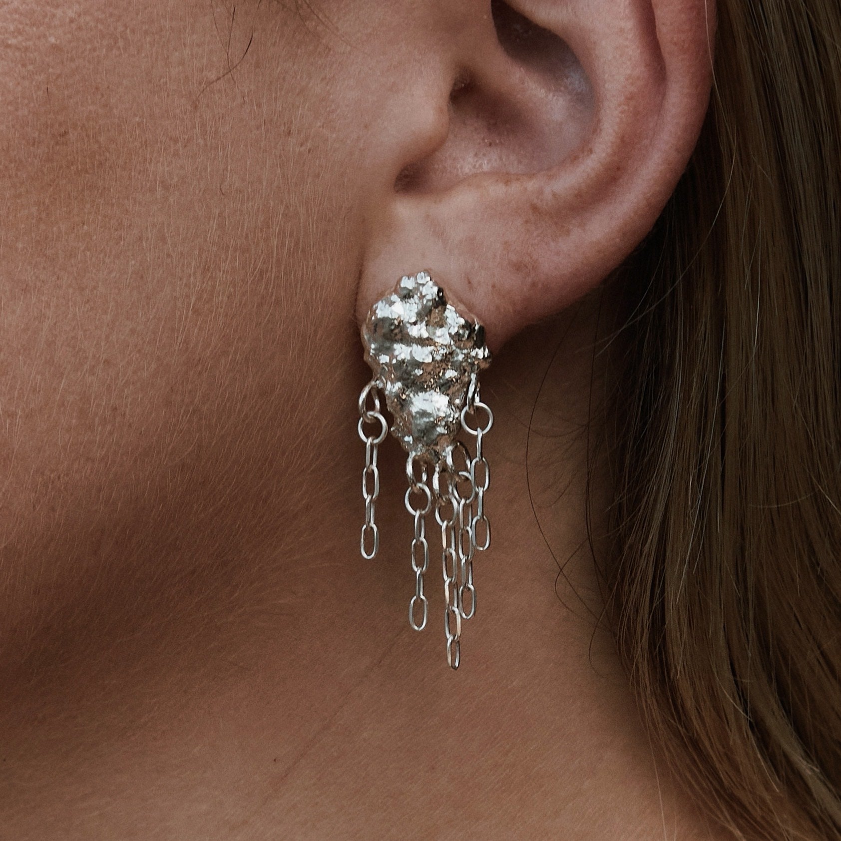 If you're searching for earrings for an event, these are the ones. Dramatic enough for a gallery opening or a night at the opera, yet edgy enough for underground parties and late-night rooftops. They bring presence without shouting, elegance without softness, and sophistication with a twist. The SNAPDRAGON earrings are not here to blend in. These are for the daring, the unapologetic, the ones who know that jewelry should never be an afterthought. Handcrafted from 925 sterling silver, each earring begins with a textured “burnt” silver base – raw, rugged, and full of attitude. From that molten form, fine silver chains cascade down, catching the light and dancing with every movement.